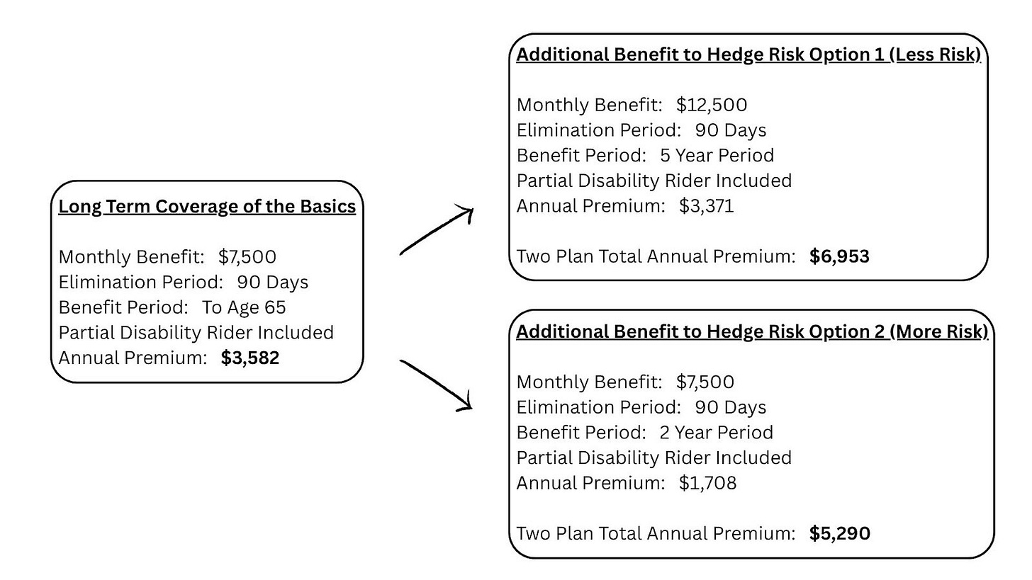 Option 2 - This multiple policy approach carries higher risk for long-term disabilities (lasting more than two years). However, if an individual is disabled for two full years or less, close to the average, they would still receive maximum income replacement. This is achieved through a combination of a $7,500 monthly benefit to age 65 plan and a $12,500 monthly two-year benefit plan. The advantage of this structure is the cost savings. The combined premiums are $4,200 less annually than a single $20,000 monthly benefit plan. Over time, especially if the disability occurs later in the individual’s career, this difference in cost can be significant.